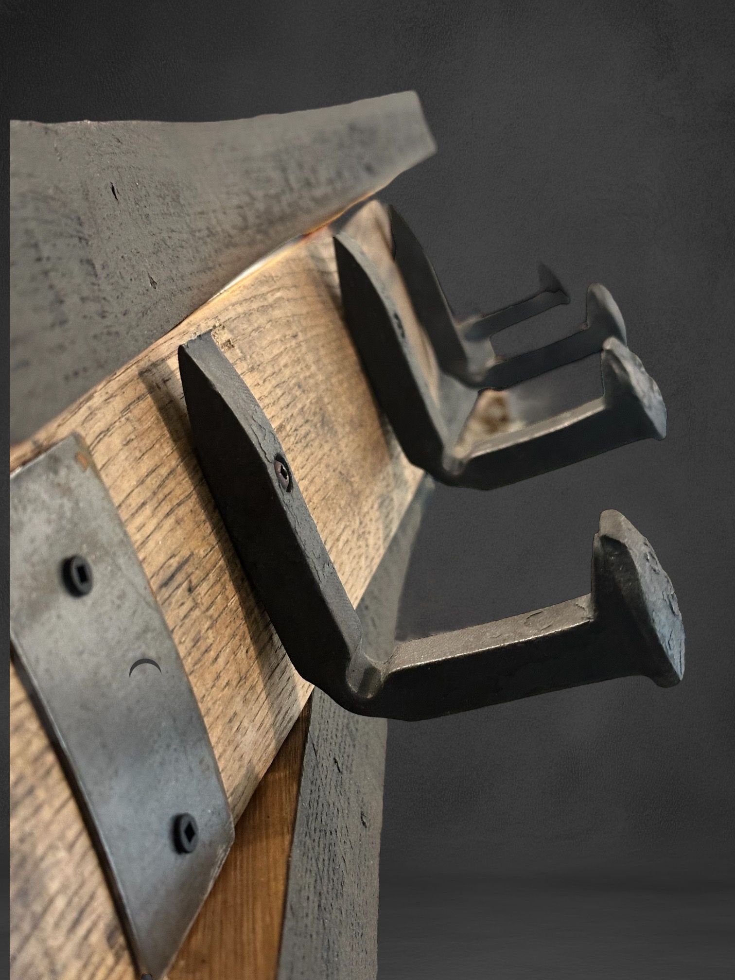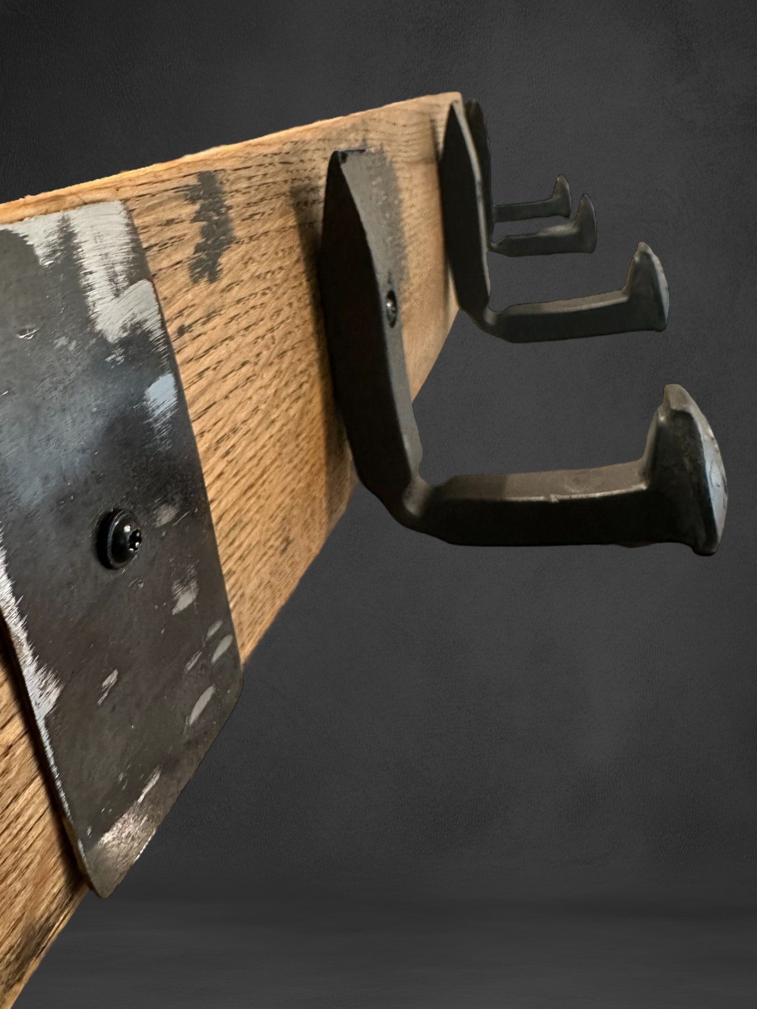 The Bourbon Stave / with local La Grange Kentucky Rail Road Spike Coat rack. Is a unique and stylish piece that combines the rich history of bourbon country with the heritage of the rail road industry. Crafted from reclaimed bourbon barrel staves and authentic railroad spikes sourced from La Grange Kentucky, this coat rack is a true representation of local craftsmanship and ingenuity.